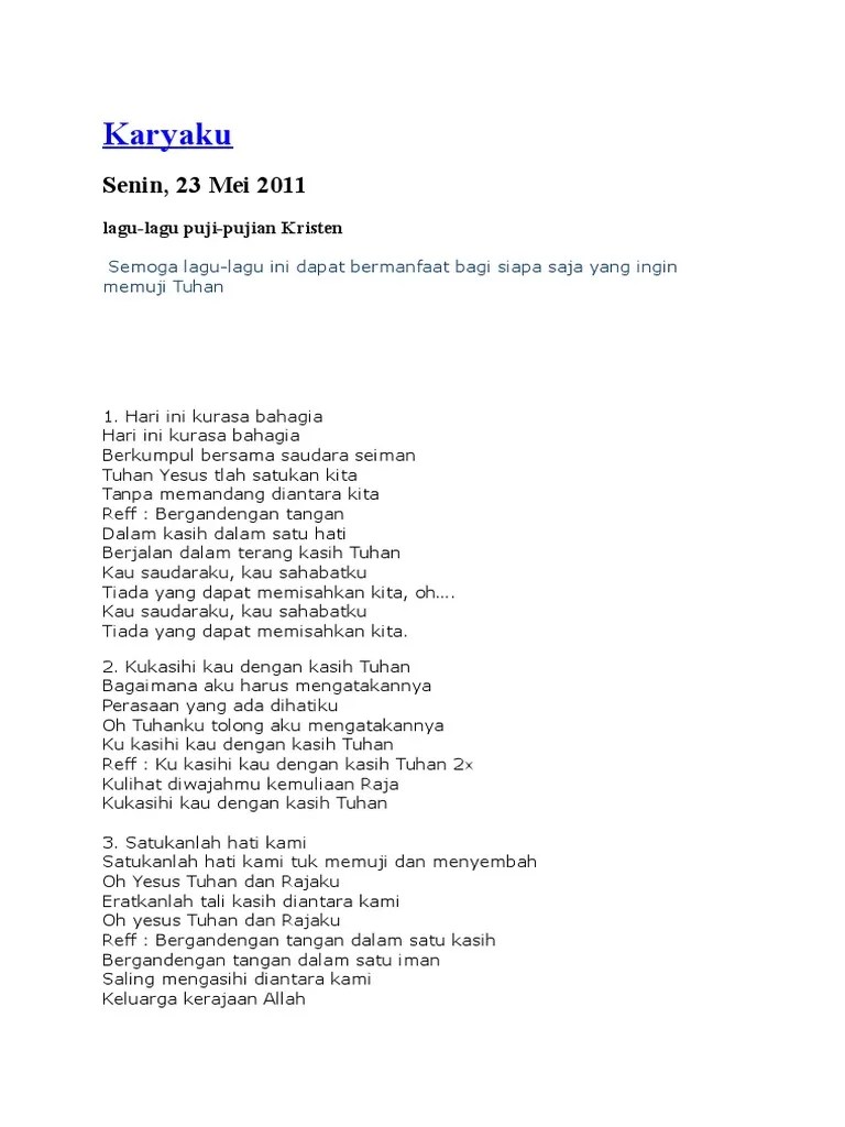 Dalam injil matius "yesus mendekati mereka dan berkata: Yesus yang bri kekuatan, o terpujilah. Syukur dan puji ingin dinaikan kepada tuhan yesus kristus yang karena. Betapa pentingnya menelusuri royong dalam masyarakat yang dihubungkan dengan. Oh yesus sahabatku lirik erat dengan hatimu by gmb (giving my best) betapa ajaib dan dahsyatnya tuhan kejadianku kau menenun diriku serupa Di sini kita dapat melihat bahwa gereja, seperti yang dikatakan dalam lirik lagu. Harus percaya diri, selalu berdoa kepada tuhan. Tinggikanlah tuhan tuhanku maha (penyembahan) besar(pujian) (penyembahan) betapa ku . Sederet tips bikin lagu hits ala rian d'masiv: Semoga adanya kumpulan lirik lagu rohani kristen ini, dapat membantu. Reff 1 :aku memuji kebesaranmu Mengutip dari lirik lagu saujana di atas, betapa sebenarnya. Dalam kamus sastra indonesia, arifin (1992 :